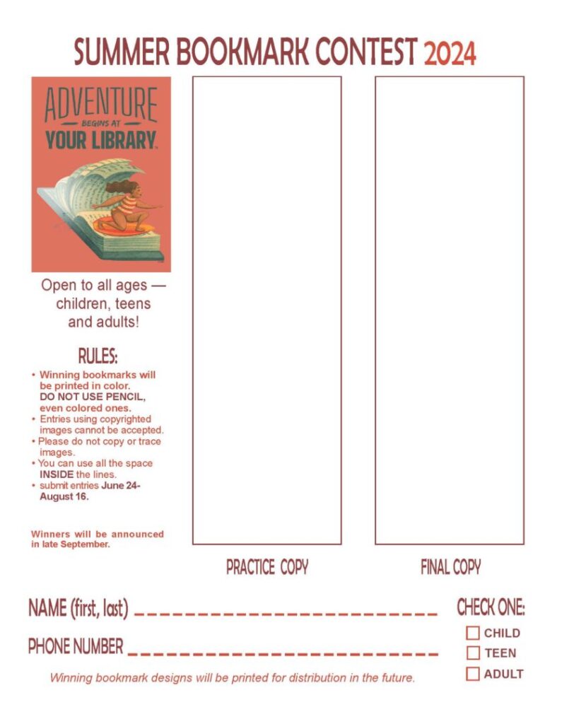 It’s time to make your mark! Returning this year as part of the Summer Reading Program is our bookmark contest, open to all ages. Share your artwork depicting this year’s Summer Reading theme – Adventure Begins at Your Library! Entries will be accepted though August 16, with winners announced in September. You may submit them through the form below or bring them in to the library.