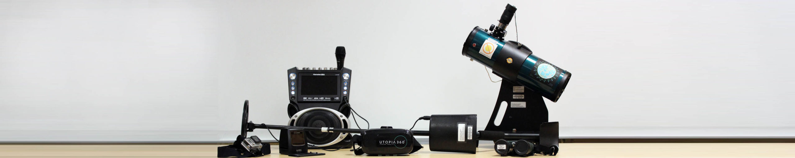 Image of some of the items in the library of things including a karaoke machine and metal detector.