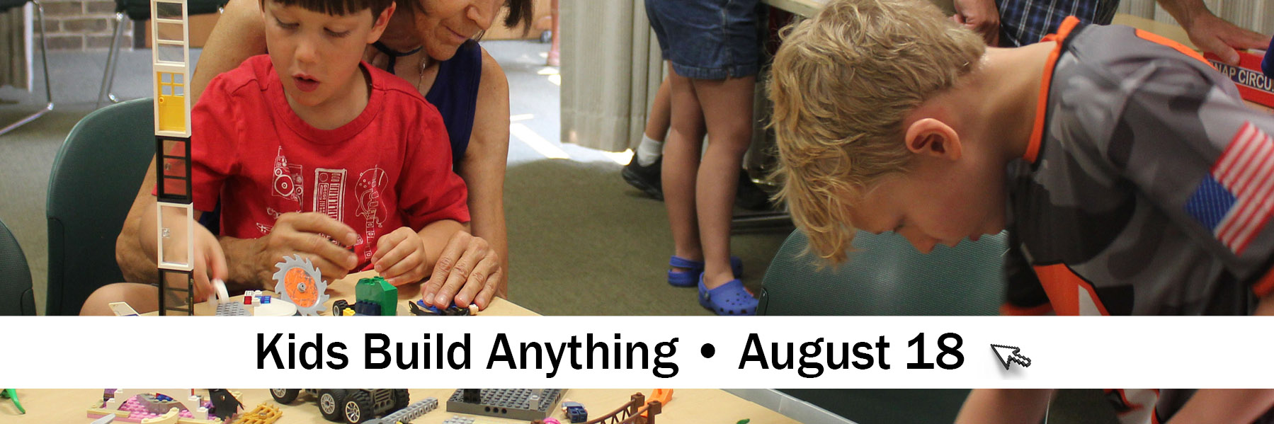 Clickable image of children building objects with legos. Text reads Kids Build Anything, August 18