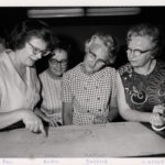 l. to r. Library director Barbara Rau, librarian Carol Alric, Marion Bardole and Mary Wasserbach examine blueprints for the new library building, 1970.