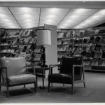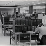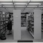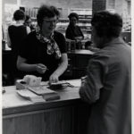 Library director Barbara Rau pitches in at the checkout desk, 1974