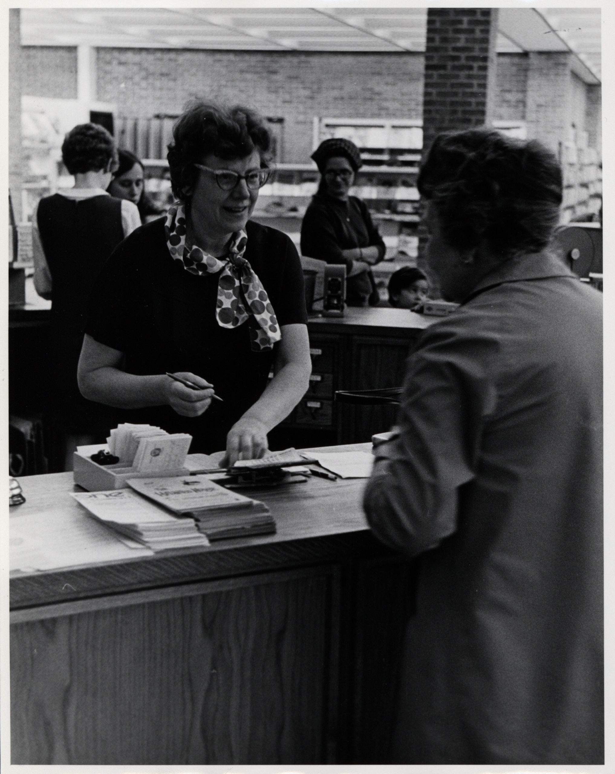 Library director Barbara Rau pitches in at the checkout desk, 1974 (Bethlehem Public Library archives)