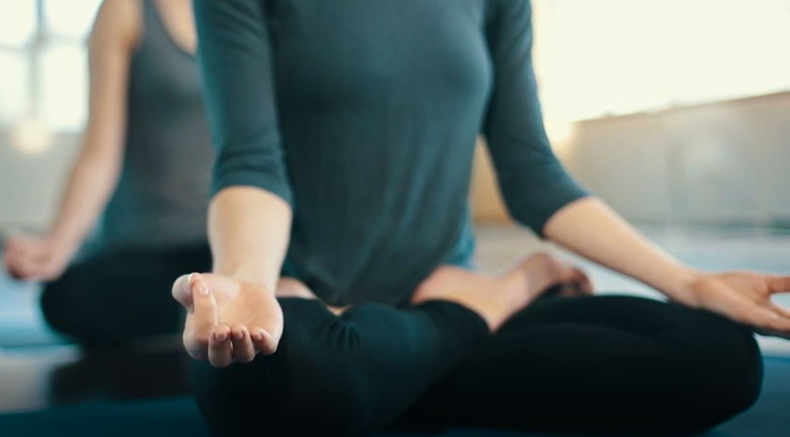 Image of an individual wearing dark clothes and sitting in the lotus yoga pose